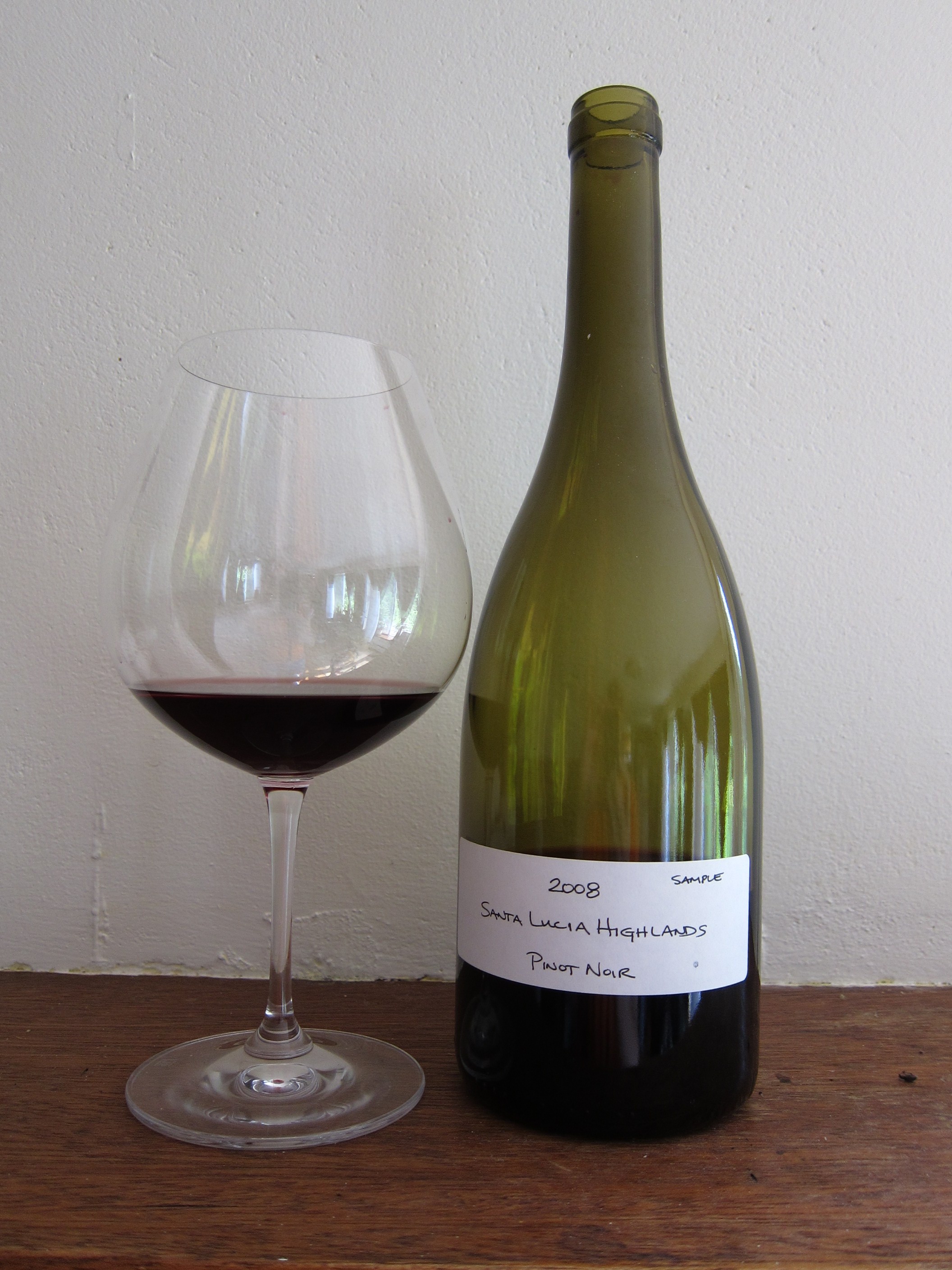 A few days ago I received a couple of samples of 2008 Pinot Noir Santa Lucia Highlands from a small, passionate producer of hand-made wines.  Last night I tasted this wine and was quite impressed.  The color is deep and dark, with a lot of density for a pinot noir.  Aromas of black cherries, cranberries and a bit of sous-bois on the nose.  On the palate the wine is mouth-filling, with juicy fruits balanced by acidity and tea tannins, and a long, smooth finish.